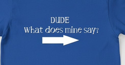 Front of shirt says, "Dude, What does mine say?" and the back says, "Sweet, what about mine?"